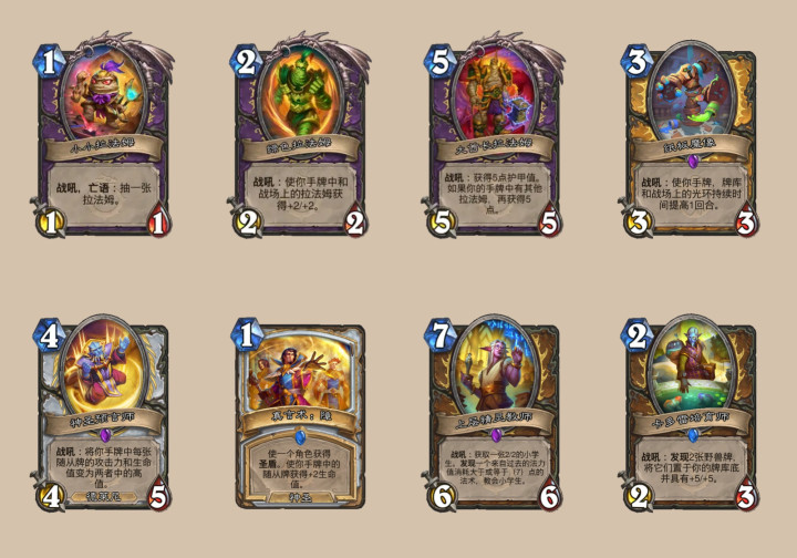 接下来是时空大盗拉法姆的改动,小小拉法姆现在战吼也能抽一张拉法姆,绿色拉法姆的战吼还可以让场面上的拉法姆也获得+2/+2,大酋长拉法姆额外获得护甲的条件从控制着其他拉法姆改成了手牌中有拉法姆,总得来说还是节奏上的小加强,不过大酋长拉法姆改过之后,又多了一张能够提醒对手下脏鼠时机的拉法姆了。剩下的加强就都是费用和身材方面的了,纸板魔像从4费4/4下调为3费3/3,神圣预言师从5费5/5下调为4费4/5,真言术:障从2费下调为1费,上层精灵教师从8费下调为7费,卡多雷培育师从3费2/4下调为2费2/3,感觉就纸板魔像加强后有可能能进构筑了,其他的还是不太行的样子。