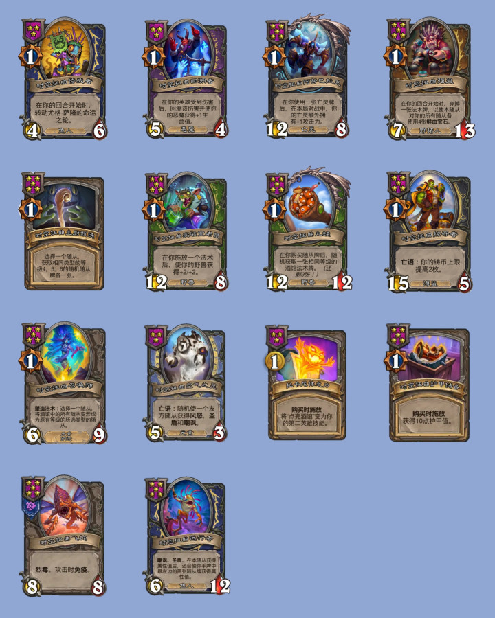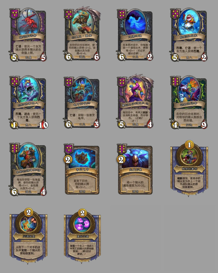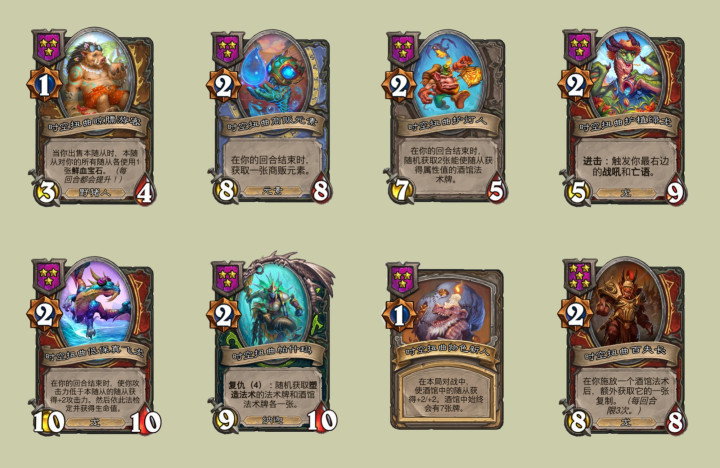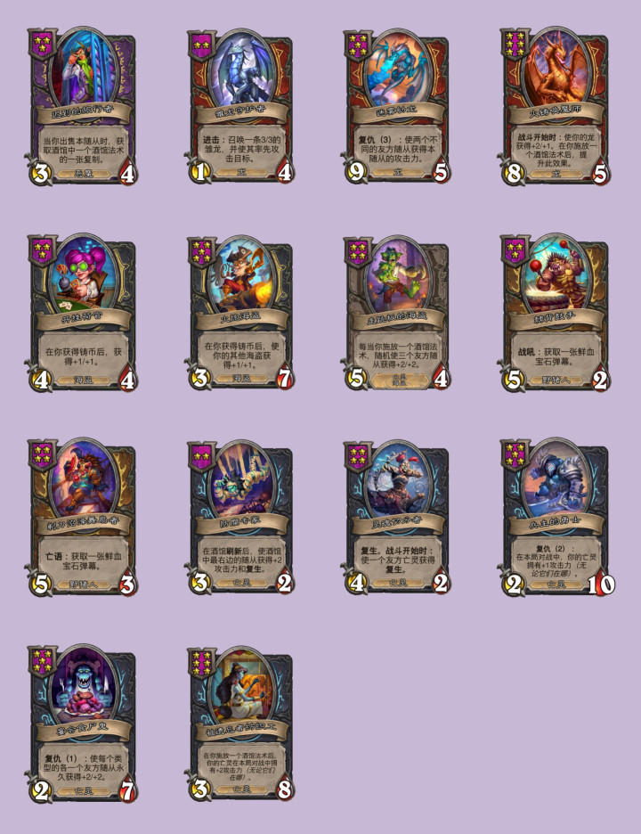 迟到的旅行者从4星3/6下调为3星3/4,雏龙守护者从1/3上调为1/4,迷雾幼龙从6星下调为5星,跳操传功套路更容易成型了,火铸唤魔师效果从+1/+1上调为+2/+1。海盗这边,开挂荷官从1/1上调为4/4,火炮海盗从6星3/8下调为5星3/7,效果也从+1/+2下调为+1/+1,走跳板的海盗,效果从+2/+1上调为+2/+2。野猪人的鲜血宝石弹幕随从集体降本,棘背鼓手从四星变三星,剃刀沼泽舞扇者则从五星变四星。亡灵随从里,防腐专家还会让酒馆最右随从获得+2攻击力,灵魂切分者的效果从给亡语随从贴复生回调成给亡灵随从了,兵主的勇士从复仇3下调为复仇2,宴会食尸鬼减少一点生命值,但复仇效果从+1/+2上调为+2/+2,被遗忘者纺织工每次施放酒馆法术后,给亡灵永久加攻从1点上调为2点,感觉平衡之后亡灵的攻击力涨得要比以前快上很多了,应该要比之前强很多了。