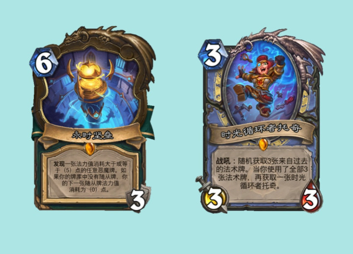 而法术瞎的另一张新卡永时坚堡也被进行了重做,现在的效果从“获取一张大于等于5费的恶魔牌”改为“发现任意一张大于等于5费的恶魔牌”,随机获取变成发现肯定是大加强,而这个“任意”意思就是现在依然可以拿到术士的恶魔牌,比如绝息剑龙,改进型恐惧魔王以及阿克蒙德。时光循环者托奇从4费4/4调整为3费3/3,但战吼随机获取的法术也从4张下调为3张,3费3/3+3张法术用起来肯定要比4费4/4+4张法术灵活很多,应该要比之前强一些了。
