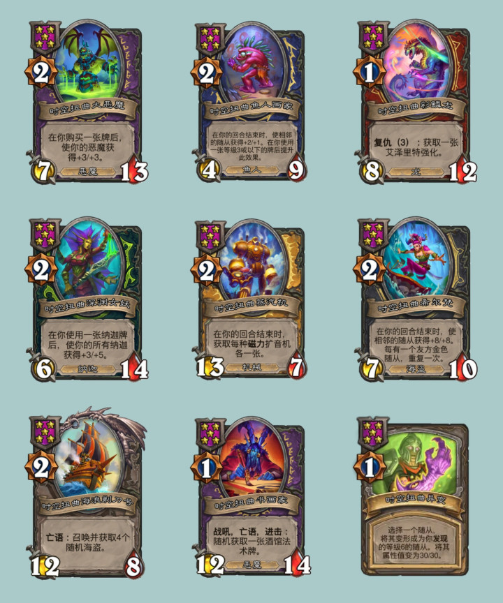 时空扭曲大恶魔的效果从+2/+2上调为+3/+3,时空扭曲鱼人画家的效果从+2/+2下调为+2/+1,不过他提升buff的效果可以跨回合保留了。时空扭曲彩鳞龙的复仇效果不演了,直接变成获得艾泽里特强化,时空扭曲深渊女妖的buff效果从+2/+4上调为+3/+5,时空扭曲蒸汽机回合结束从随机获得两张扩音机改为三种扩音机各获得一张,时空扭曲希尔梵的buff效果从+4/+4直接上调为+8/+8,时空扭曲海浪剃刀号亡语从召唤并获取3个随机海盗上调为4个。时空扭曲书画家从6/7上调为12/14,时空扭曲异变变完随从后还会使身材变成30/30。