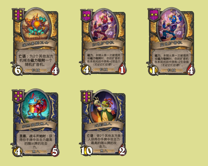 看完了天梯构筑的平衡,接下来看看酒馆战棋的平衡。首先削弱方面主要集中在机械,鱼人以及元素,埃匹希斯卫士在之前热修的削弱基础上,将亡语贴的两个绿色扩音机改成了随机扩音机,而红色扩音机和蓝色扩音机的成长效率也都从+3下调为+2了,其实清风觉得本来就应该是这样的,毕竟绿色扩音机每次成长加两点属性值,但其他两种扩音机都是加三点,之前就觉得有点别扭不够统一。鱼人这边,狂热变装鱼人从4星3/5上调为5星4/5,并且获取的身材也从属性值改为攻击力,升本是意料之中的改动,但没想到还会改成攻击力,而戏剧鱼人的亡语也从获得属性值改成了攻击力,这样就算配合瑞文也只会让随从的攻击力比较夸张,相当于物理剧毒,最后会很容易死于屁股太小。