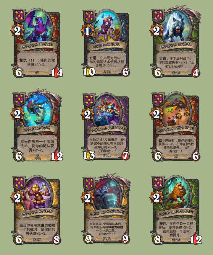 时空扭曲暮喉龙复仇效果从+3/+3上调为+4/+3,时空扭曲恶鬼的能使效果从+1/+1上调为+2/+1,时空扭曲戈德林的初始身材从4/4上调为6/4,同时效果也从+2/+2上调为+3/+2,时空扭曲钩尾的效果从+2/+1上调为+2/+2,时空扭曲小鬼渗透者触发效果条件从花掉10枚铸币下调为8枚,时空扭曲增强幼龙的则是从花掉8枚下调为5枚。时空扭曲解译者的效果从+3/+1上调为+3/+2,时空扭曲电荷金刚效果吸附的磁力从3/3上调为4/4,时空扭曲丛林狮王现在还获得了潜行关键词,并且效果也由+2/+1上调为+3/+2。