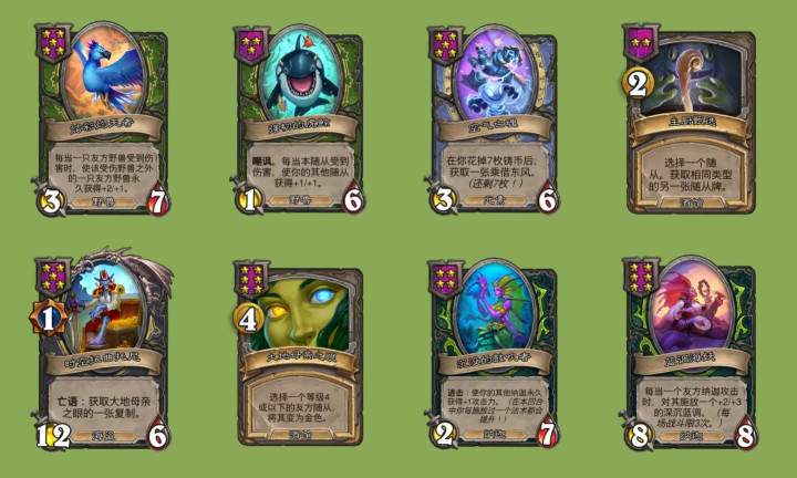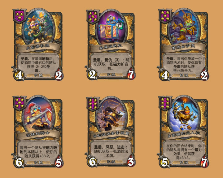 加强随从方面,机械得到了补偿性加强,现在史前修补匠刷新后不仅会给酒馆最右贴圣盾,还会+2/+2,金属派送机身材从1/8调整为2/7,同时自带圣盾了,蓄能女沙皇身材从5/3下调为4/2,效果从+3攻击力上调为+4攻击力,废铁枪骑士初始身材减少一点生命值,但效果从+3/+1下调为+3/+2,自动漩涡套索装置从7/4下调为6/3,但是现在真的会带圣盾了,这下终于没有文本bug了,多面辅助无人机从6/8下调为5/7,但回合结束的效果从+2/+2上调为+3/+3。